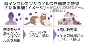 東京大学などの研究グループが行った動物実験で、牛経由でヒトに感染したウイルスは、少量の飛沫でも感染し、従来のウイルスよりも高い致死率を示した。